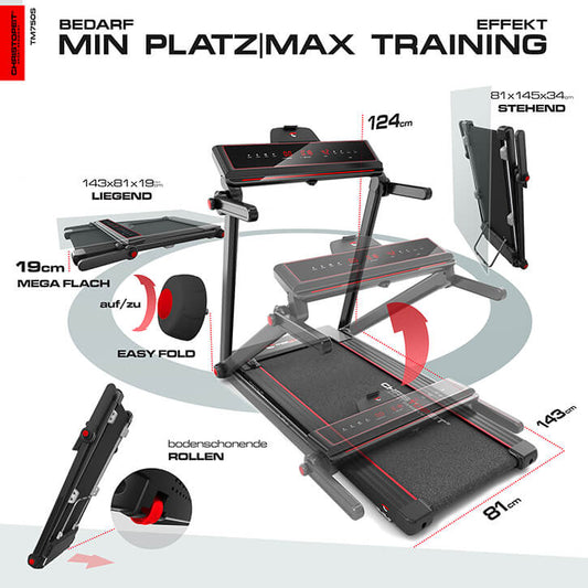 Bei dem Laufband kommt es verständlicherweise auf die Lauffläche an. Genau genommen ist sie für drei wesentliche Aspekte von Bedeutung. Für das Lauftempo, die Körpergrösse und auch die Sicherheit. Läufer haben jeweils unterschiedliche Laufstile. Wenn du nur ein leichtes Lauftraining absolvieren willst, genügt ein Laufband mit einer Lauffläche von 140 x 50 Zentimeter. Solltest du hingegen intensiver laufen und auch mal ein bisschen sprinten, sollte es eine Lauffläche von idealerweise 150 Zentimeter Länge sein. Je grösser du übrigens bist, desto grösser ist auch deine Schrittlänge. Das wirkt sich ebenfalls auf die Lauffläche des Laufbandes aus. Wer grösser als 175 Zentimeter ist, benötigt eine Fläche von 150 x 50 Zentimeter. Fakt ist ausserdem, dass eine grössere Lauffläche auch immer mehr Sicherheit bietet. Das solltest du beim Laufbandkauf ebenfalls beachten.