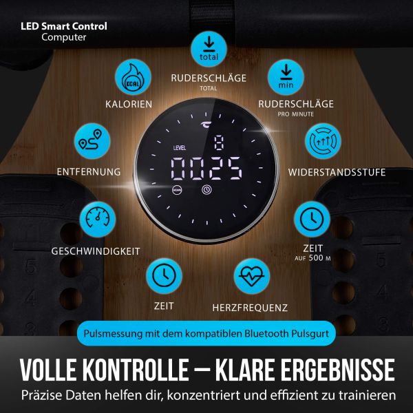 • Smart Control Anzeige mit allen relevanten Daten: Zeit, Geschwindigkeit, Distanz, Kalorien, Schläge, Zeit/500 m, Widerstand, Schläge/Minute, Herzfrequenz & Scan-Funktion