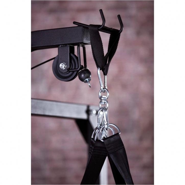 Um die Schlaufen zu den passenden Einheiten zum Einsatz zu bringen, reicht es, wenn du die Schlaufen einmal doppelt um einen Ständer oder einen Pfeiler legst. Da der Lieferung des Sets an Schlaufen noch ein Karabinerhaken beiliegt, ist es denkbar einfach, den Griff beziehungsweise das Rope dort zu befestigen. Damit gehören die Sorgen, keinen passenden Ort für deine Griffe zu finden, für immer der Vergangenheit an. So gerüstet, hast du genug Gelegenheit, dich auf das zu konzentrieren, worauf es im Training wirklich ankommt: dein Körpergefühl und dein Workout.