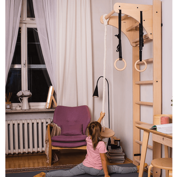 Das Set besteht aus: einer aus Buchenholz gefertigten Sprossenwand (8 ovale Sprossen), einer abnehmbaren Klimmzugstange aus Buchenholz und Zubehör für Kinder (Turnringe aus Holz, Baumwollkletterseil mit Schaukelbrett)
