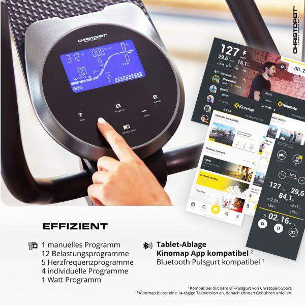Der Computer mit dem hintergrundbeleuchteten LCD-Display ermöglicht alle relevanten Anzeigenwerte auf einen Blick. Dieser lässt sich sehr gut ablesen und durch einfaches Tippen auf den Tasten leicht bedienen. Individuelle Trainingsziele können durch Auswahl der verschiedenen Programme realisiert werden. Zusätzlich verfügt der Computer über eine Halterung für das Tablet oder das Smartphone. Ein abwechslungsreiches Training mittels der fest hinterlegten 12 vorgegebenen Belastungsprogramme ist genauso einfach realisierbar, wie mit den 5 Herzfrequenzprogrammen. Mit den individuellen Trainingsprogrammen kann man sich eigene Trainingsprofile zusammenstellen und das drehzahlunabhängige Wattprogramm ermöglicht ein gezieltes, gleichmässiges Belastungstraining bei frei wählbarer Trittfrequenz. Die Fitness Test Funktion beurteilt nach dem Training deine Trainingsleistung einfach nach dem Schulnotenprinzip und die Körperfettanalyse informiert über FAT % und zeigt einen Trainingsprogrammvorschlag.
