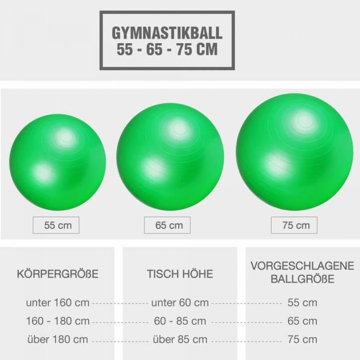 Ein Fitness- oder Gymnastikball mit 55 cm Durchmesser ist eine kleine Variante des praktischen und vielseitigen Sportgerätes. Am besten ist diese Grösse für Menschen mit einer Körpergrösse bis 155 cm geeignet. Grössere Sportler können diese Bälle ebenfalls nutzen, aber nicht alle Übungen mit einem Ball dieser Grösse durchführen. Die Auswahl der Farbe ist eine Frage des Geschmackes, wobei es jedoch sinnvoll ist, unterschiedliche Grössen in verschiedenen Farben zu erwerben.