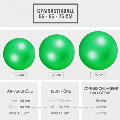 Der Gymnastikball ist in drei Grössen erhältlich und eignet sich ideal zur Stärkung von Rücken und Bauchmuskulatur. Meh Infos