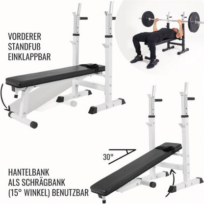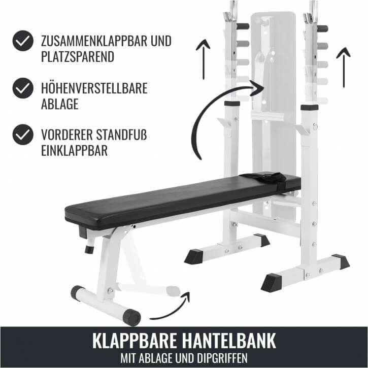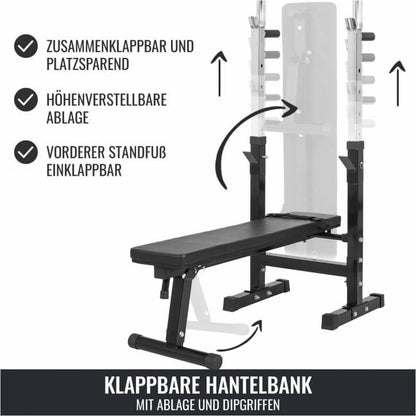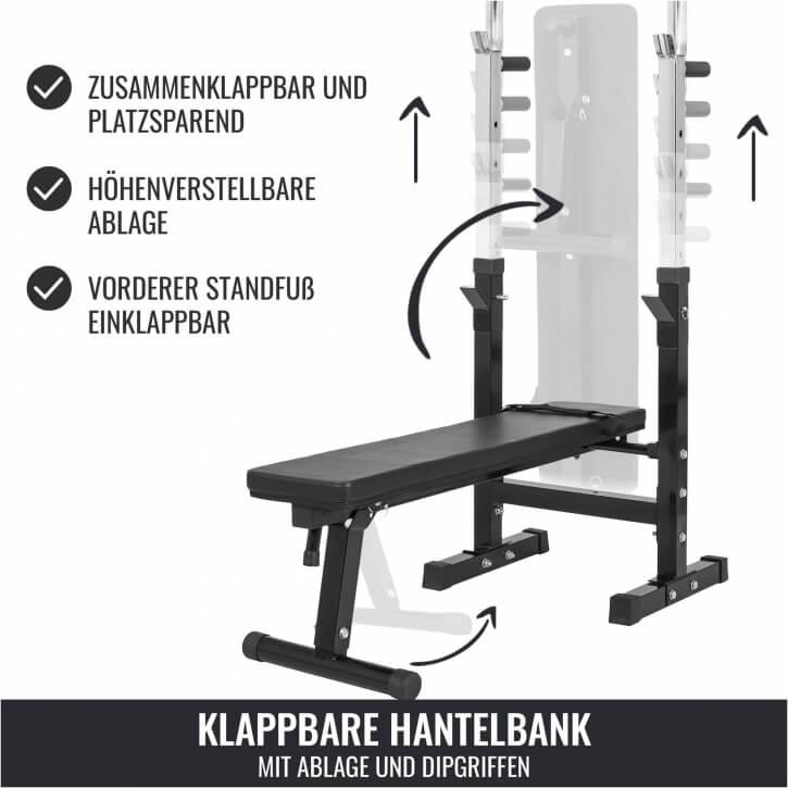 Dieses Gerät ist aber auch deshalb für Einsteiger und Hobbysportler interessant, weil die Bank nach dem Training einfach hochgeklappt werden kann und so nur einen Bruchteil des Platzes einnimt. Zudem gehört hierbei ein 100 kg Komplettset inkl. einer Langhantel-, zwei Kurzhantel- und einer Sz-Stange zum Lieferumfang, was auch für bereits fortgeschrittene Sportler interessant ist. So lassen sich ohne weiteres Schultern, Arme, Brust, Rücken, Bauch und Beine trainieren - dank der zahlreichen Hantelscheiben mit praktischem Kunststoffüberzug auch lange an der Grenze der eigenen Leistungsfähigkeit!