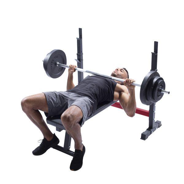 Die Liegefläche mit ihrer verstärkten Tragekonstruktion ist mit einem robusten und hochwertigen Kunstleder bezogen. Auszeichnen tut sich die WB 1000 durch ihre hohe Belastbarkeit von 200 kg (inkl. Hanteln und Gewichten). Auf den Ablagen finden die Hantelstange sowie gesondert die Hantelscheiben ihren richtigen und sicheren Platz.