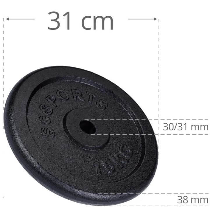 Unsere robusten Hantelscheiben aus hochwertigem Gusseisen sind besonders widerstandsfähig und perfekt geeignet für ein intensives Training. Guss Hantelscheiben sind aufgrund ihrer Beschaffenheit sehr langlebig und bleiben auch bei starker Beanspruchung formstabil. Damit die Scheiben auch bei hartem Auflegen nicht so leicht zerkratzen, sind sie aus massivem Gusseisen gefertigt. Sie werden nicht nur beim Kraftsport und Cross-Training genutzt - sondern auch im Fitness- und Rehabereich verwendet. Die Gusscheiben haben einen Lochdurchmesser von 30/31 mm und sind somit perfekt auf alle gängigen Hantelstangen mit einem Durchmesser von 30 mm abgestimmt. So wird ein Verrutschen oder Klappern während des Trainings verhindert.