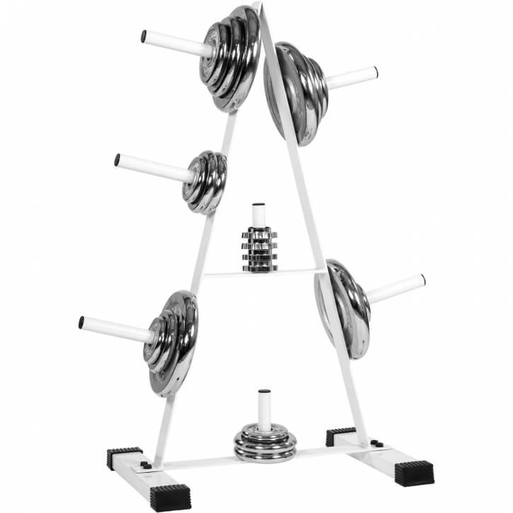 Mit diesem stylischen Scheibenständer können Sie Ihre Gewichtsscheiben mit ca. 30 mm Innendurchmesser platzsparend und sicher verstauen. Die stabile Stahlkonstruktion mit gepolsterten Füssen bietet mit sieben Haltestangen mehr als genug Platz für Ihre Hantelscheiben. Endlich haben Ihre Gewichte einen festen Platz im heimischen Fitnesstudio und sind so immer griffbereit.