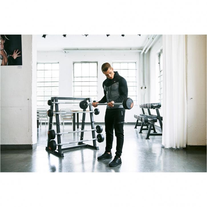 Der Kern der Stangen besteht aus stabilem Gusseisen, die Rubber Barbells selbst sind mit einer dicken Gummischicht ummantelt. So macht es ihnen nichts aus, wenn eine Hantel mal auf dem Boden landet – was leicht passieren kann, wenn du nach den neuen Übungen im Triumph die Hände zum Jubeln öffnest. Die Gummigewichte umfassen Gewichtsklassen von 10 kg bis 50 kg, die Durchmesser verändern sich entsprechend von 11 cm auf 19.5 cm bei 50 kg Gesamtgewicht. Wenn du es ganz perfekt haben willst, dann legen wir dir noch das Rubber Barbell Rack ans Herz. Hier kannst du deine Gewichte optimal lagern.