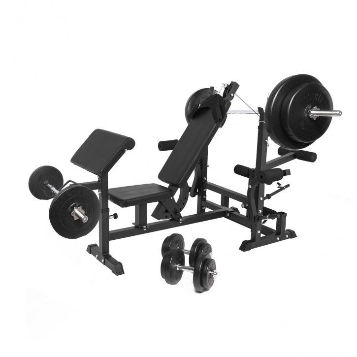 Für die Brust bietet sie neben Butterfly-Armen natürlich die obligatorische Langhantelablage fürs Bankdrücken - sowohl gerade, als auch schräg. Die vielfach einstellbare Bank ist in Verbindung mit dem Beincurler-Aufsatz auch für Sit-ups perfekt geeignet. Mit den, in die verstellbare Ablage integrierten Dip-Griffen und dem Kabelzug wird der Trizeps, mit dem Curlpult der Bizeps trainiert. Und für die vorderen sowie hinteren Oberschenkel ist diese Kraftstation auch mit einem Beincurler ausgestattet.