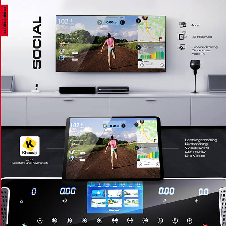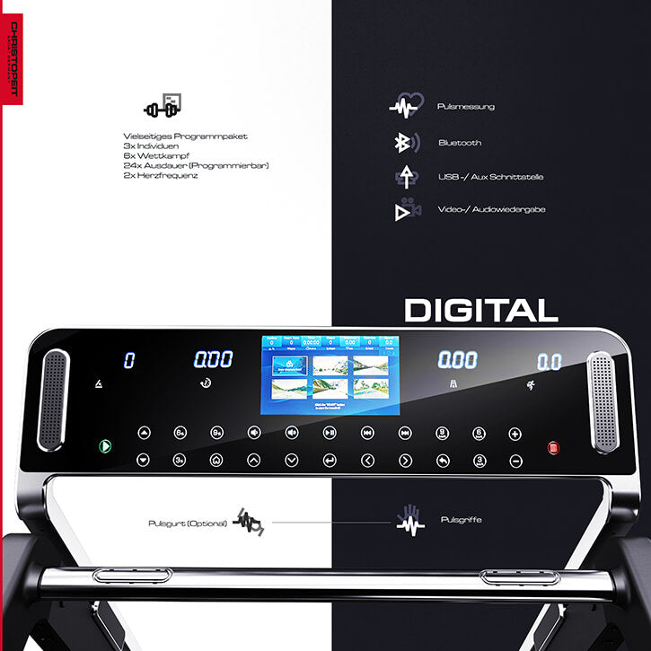 Der innovative, sehr gut ablesbare und beleuchtete LED Computer mit integriertem 7“ TFT-Display bietet alles, um ein motoviertes Lauftraining zu absolvieren. Die easy-touch Bedienfelder ermöglichen eine super leichte Eingabe. Die vier grossen Anzeigen für Entfernung, Zeit, Geschwindigkeit/Pulsfrequenz und Steigung/ca. Kalorienverbrauch informieren konstant über das Training. Die Direktwahltasten für Steigung (Stufen 3.6 und 9) und für Geschwindigkeit (3 KM/H, 6KM/H und 9KM/h) sorgen für einen sofortigen Trainingsbeginn. Aus den 50 Trainingsprogrammen kann man sich favorisierte Programme aussuchen oder nach eigenen Vorstellungen trainieren. Über das TFT-Display kannst du deine Lieblingsvideos oder Musik abspielen. Über die Bluetooth Verbindung kannst du dich mit der FitShow-App verbinden und die Trainingsdaten speichern. Ein Audio Anschluss ermöglicht Musik von externen Geräten über die Lautsprecher des Laufbandes abzuspielen und der Kopfhöreranschluss kann alternativ zu dem Lautsprechersystem genutzt werden. Die versenkbare Halterung für Tablet und Smartphone rundet die Möglichkeiten für ein motivierendes Training ab. Über den im Computer integrierten Pulsempfänger (un-codiert 5.0-5.5kHz) ist ein gezieltes Training mit genauer Pulsüberwachung möglich. Die Vielzahl der Trainingsprogramme (20 individuelle Programme, 12 Wettkampfprogramme, 17 Ausdauerprogramme und auch die 6 virtuellen Laufstrecken) werden durch eine sehr genaue visuelle Darstellung zum absoluten Trainingserlebnis. Das integrierte Lautsprechersystem lässt keine Wünsche übrig. Das Soft-Drop-System unterstützt Sie beim Ausklappen der Lauffläche und zum Standortwechsel werden automatisch 4 Transportrollen aktiviert um das Laufband leicht und platzsparend wegzuschieben.