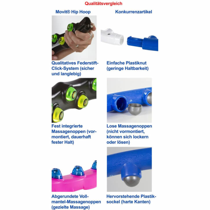 Das Training mit dem MOVIT® Hip Hoop hält dich nicht nur fit, sondern macht zudem auch noch Spass! Beim Training wird das Gewebe im Bereich um Bauch, Hüfte, Po und Oberschenkel besonders trainiert und massiert. Schon nach einer kurzen Zeit mit täglichen Übungen wirst du die Fortschritte bewundern können. Zum Training draussen im Garten oder im Park bei schönem Wetter, aber auch zu Hause bei schlechterem Wetter. 80 integrierte Magnete sorgen für ein kraftvolles Magnetfeld, welches während des Trainings seine Wirkung auf wichtige Energiepunkte im Organismus entfaltet und das sogenannte Qi in seinem Fluss unterstützen soll. Magnetfelder werden daher zur Aktivierung von Selbstheilungskräften und einer Verbesserung der Blutzirkulation für mehr Sauerstoff- und Nährstofftransport in die Zellen angewendet.