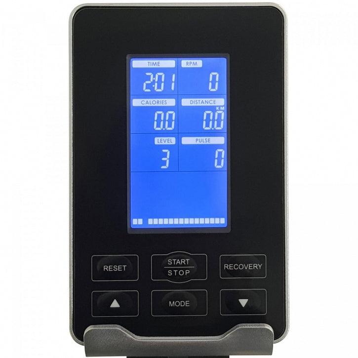 Das Cockpit des Speed Bikes SX 3 ist mit einem Multifunktions-LCD-Display ausgestattet. Die Blue-Backlite Hintergrundbeleuchtung sorgt für beste Sicht auch bei dunkler Raumumgebung. Die schweissresistente Folientastatur mit 6 Funktionstasten sorgt für eine einfache Bedienung. Das Display zeigt auf einen Blick:
